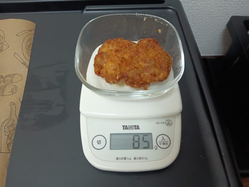 冷凍状態での計測値は115g。ななチキ(85g)をこの時点で大きく引き離しています。調理による目減りを含めても、圧倒的なボリュームを維持しているのは驚異的です。