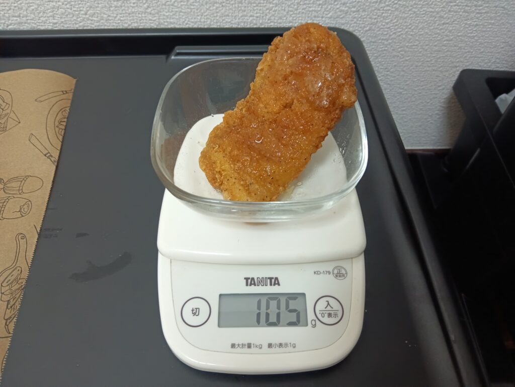 調理後の実測で105gをマーク。冷凍時の115gから加熱で多少水分は抜けるものの、それでも100gの大台をしっかりキープ。コンビニチキンを圧倒する『肉の重量感』が数値で証明されました。