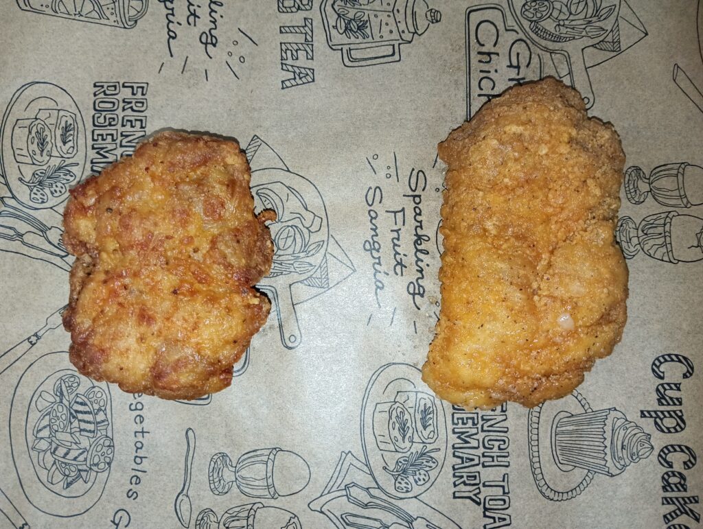 「左がななチキで、右が骨なしフライドチキンです。並べてみると、ロピアの方が明らかに一回り以上デカい……!価格は半分以下(約135円)なのに、サイズでもななチキを圧倒するという、まさに『下克上』の光景です。このサイズ差が、そのまま『満腹度の差』に直結します。」