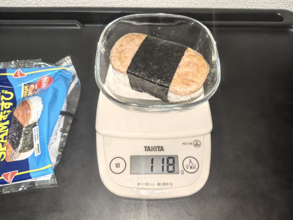 デジタルスケールでの実測値は118g。通常のおにぎりが約100gであることを考えると、持った時のズッシリ感には期待が募ります。さらに驚くべきは、手に持った時の圧倒的な存在感を生む「厚み」です。