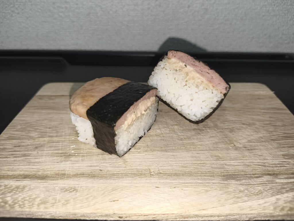 包丁を入れて中を見てみます。なんと、SPAM・ツナマヨ・お米の層が端から端まで均一に重なっています。コンビニ飯にありがちな「中央にだけ具がある」という手抜き感は一切ありません。中までぎっしり!