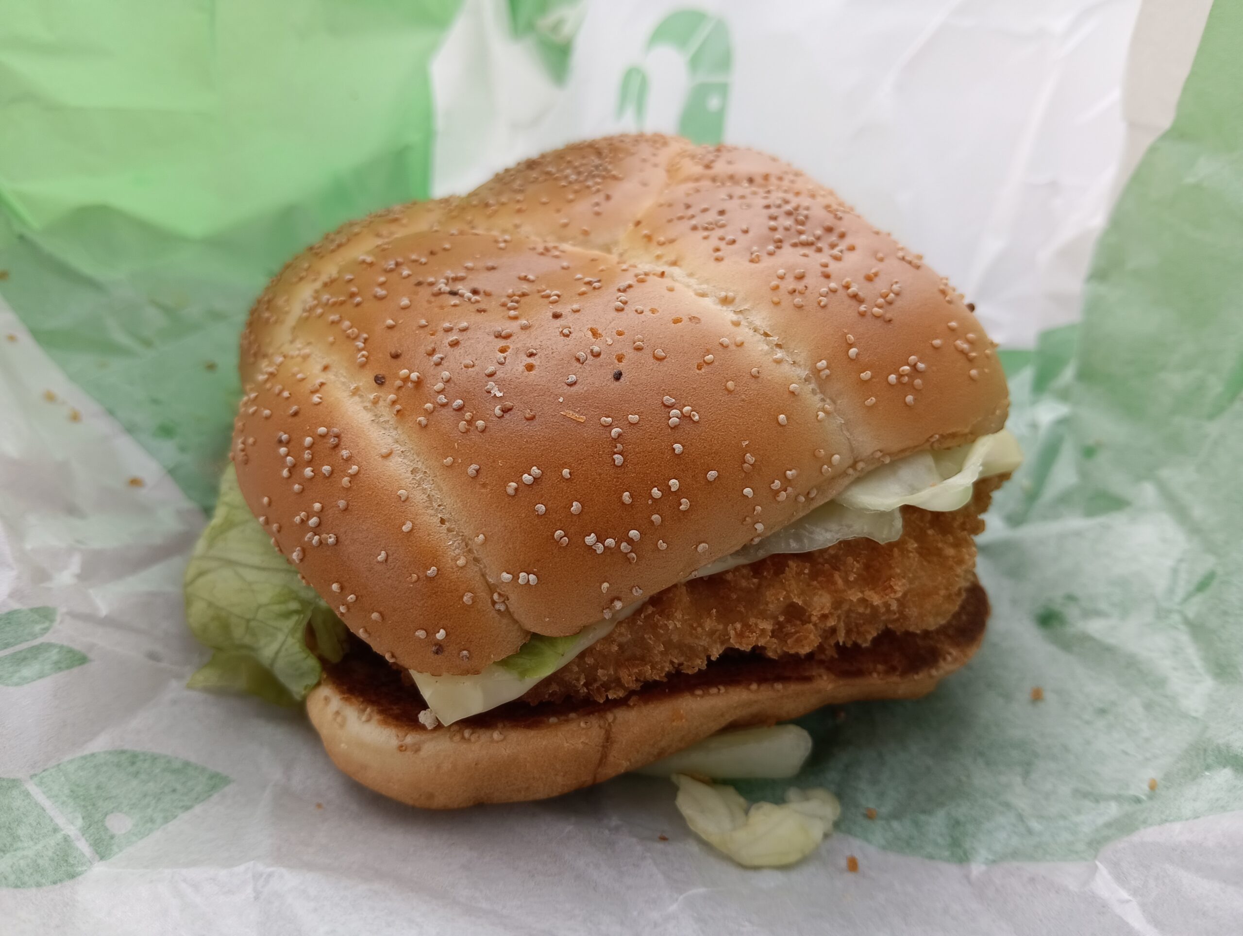 包みを開けると、通常のマックとは違う四角いバンズがお目見え。見た目からして少しリッチな気分にさせてくれます。そして漂ってくるのは、食欲をそそるガーリックの香ばしい匂い。エビカツもしっかり厚みがあり、期待が高まります!